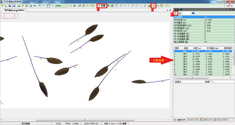 利用LA-S根系分析系统计算稻谷芒的长度、粗度等信息
